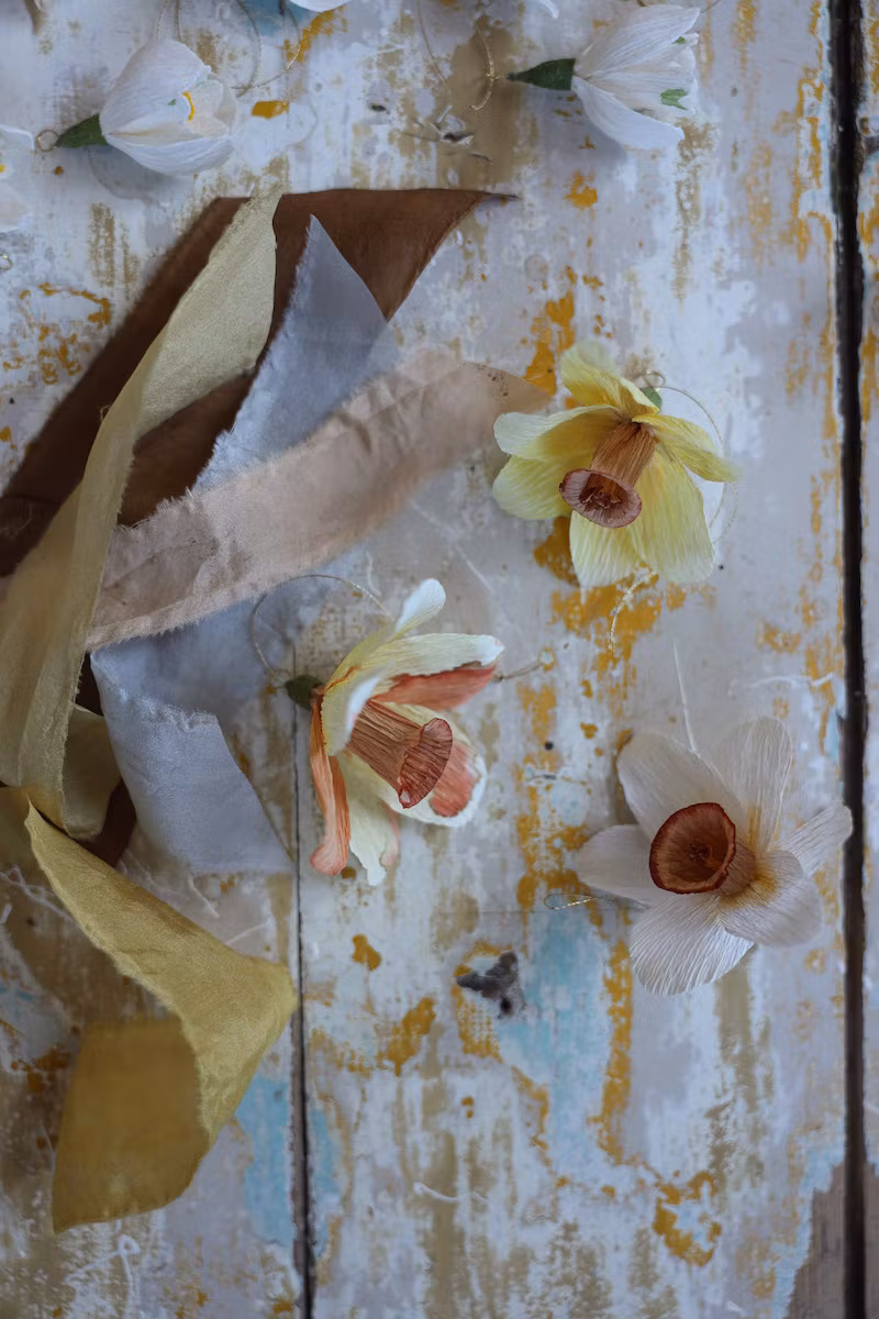 Handgjorda hängen med narcisser, 3 st i crepepapper. 5 st växtfärgade sidenband att knyta i vårris. Färgat av valnöt, avokado, lökskal och rödlök med rost.